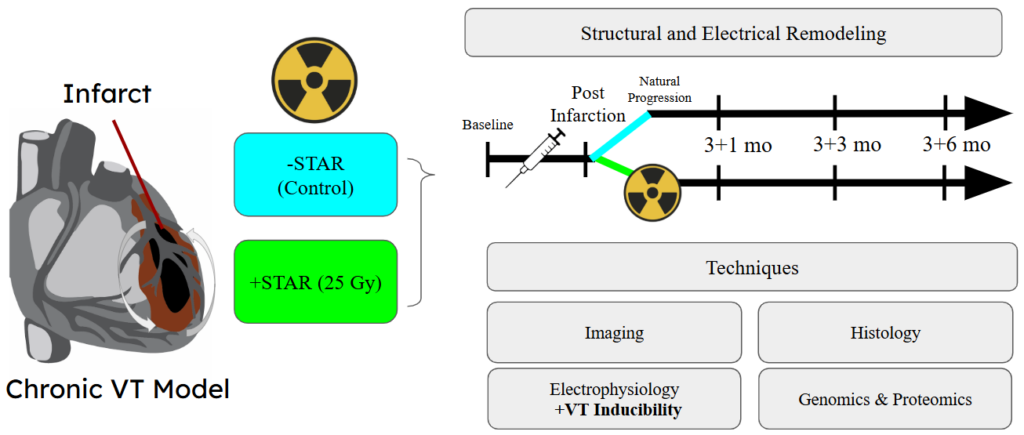 We also utilize pre-clinical experimental models to investigate novel therapies and mechanisms to help improve the clinical approach and treatment of VT. A newly developed non-invasive technique, stereotactic radiotherapy (STAR), uses external beams of energy to disrupt the underlying VT circuit and treat the arrhythmia. Our understanding of why STAR is an effective treatment remains limited. To enhance our understanding, we are investigating the time- and dose-dependent effects of STAR in both healthy and diseased preclinical models.