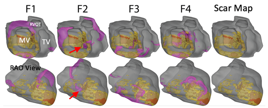From medical imaging (MRI/CT), we can generate highly detailed models of cardiac electrophysiology (Check out the Digital Twins page for more information). We can then simulate ventricular tachycardia and characterize the circuit morphology. The figure below demonstrates VT wavefront propagation in one of our biventricular computational models, including scar and fibrosis information.